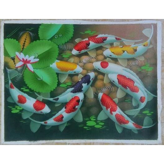 Lukisan Ikan Koi Berkualitas 80x60Rp199999. Lukisan 9 Ikan Koi istimewa ini memiliki kualitas karya seni tinggi warna-warna ikan terlihat cerah dengan detail sisik masing -masing ikan koi yang begitu memukau berenang didalam kolam ber air jernih alami berhiaskan keindahan bunga teratai sebuah kombinasi alam yang sempurna dan sangat istimewa untuk anda tempatkan dimanapun sudut. Biasanya jumlah ikan koi dalam lukisan feng shui adalah 9.